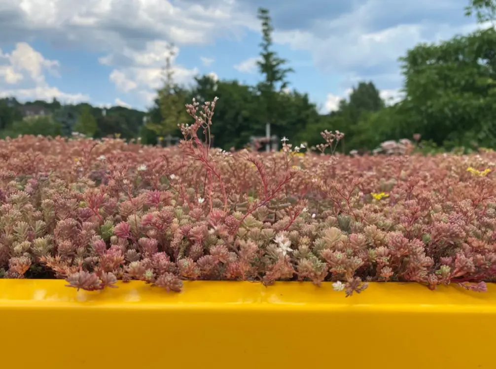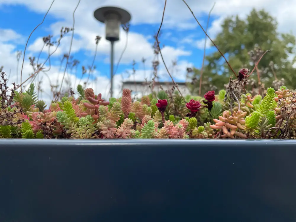 Diese Mischung aus vorkultivierten Sedumpflanzen – auch als Fetthennen oder Mauerpfeffer bekannt – kann in Kasetten aus recyceltem Kunststoff ganzjährig auf dem Dach des VELODEPOs platziert werden. Zum Zeitpunkt der Lieferung sind die Kasetten mindestens zu 95 % bewachsen. Die spezielle Pflanzenart ist gut in der Lage, Wasser in ihren dicken Blättern zu speichern. Die Dachbegrünung eignet sich deshalb hervorragend für verschiedenste Standorte und muss nur in sehr langen Trockenphasen gewässert werden. Fremdwurzler und unerwünschte Pflanzen sollten zweinmal im Jahr entfernt werden.